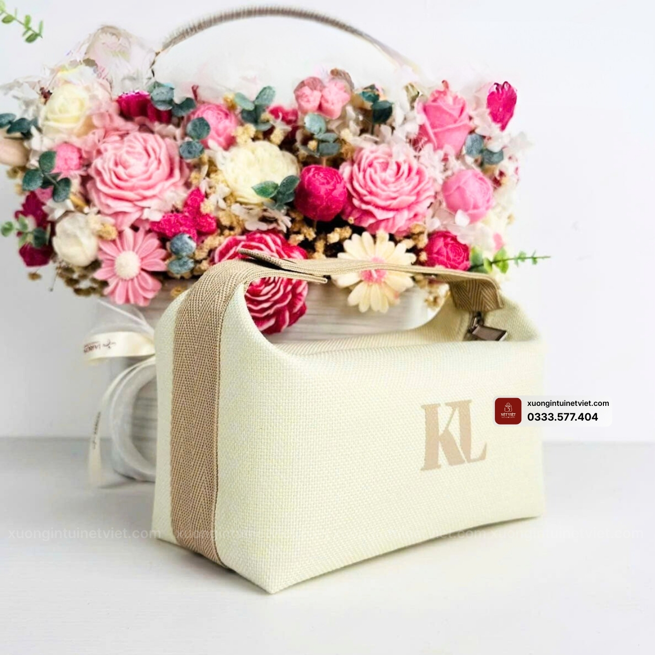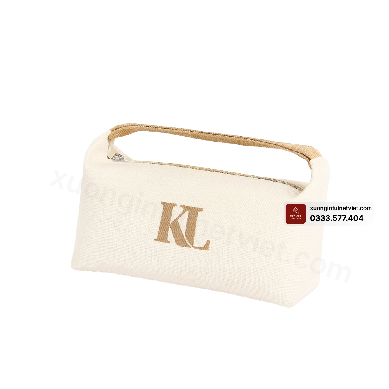 Túi vải Canvas đựng đồ trang điểm cá nhân KL là mẫu túi được sản xuất trực tiếp tại Xưởng May In Nét Việt, thiết kế gọn gàng, chắc form, phù hợp đựng mỹ phẩm cá nhân và phụ kiện trang sức. Chất liệu canvas dày, bền, in logo thương hiệu KL rõ nét, mang lại hình ảnh tinh tế và chuyên nghiệp cho quà tặng thương hiệu.